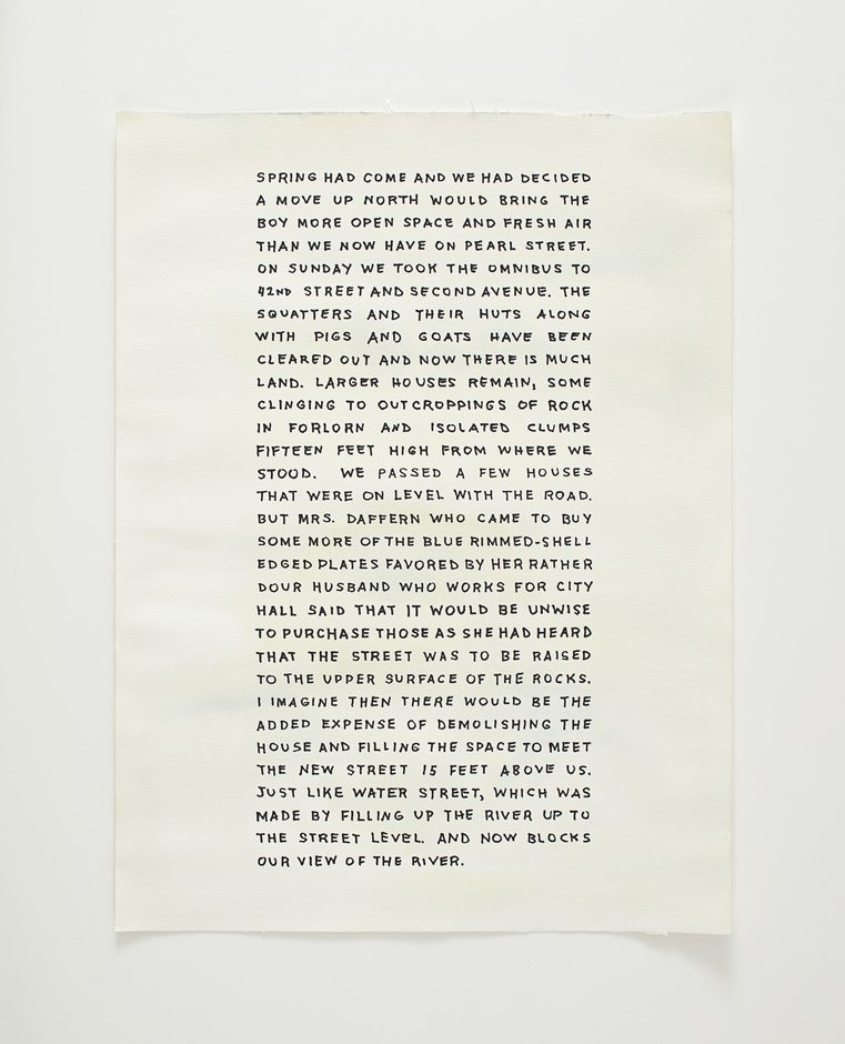 In New York topographical particularities, specificities, and relationships were literally crushed. Water was banished: rivers, creeks, streams, and ponds were drained, filled in, or covered over. Non-linearity was banished with the leveling of hills, nooks, crannies, niches as well as gullies and ravines. Marshlands and swamps were considered an affront to the settlers, and were filled in. Among the Guaraní in South America it is unfathomable to remove a hill as it would result in a change of the currents of air. In New York City, a hill became a street or material to be used to fill in a swamp. The river was defined as a set of potential real estate plots, and pieces were sold to be filled in: converting water to land to property. Thinking forests were made dumb as their mycorrhizal networks were severed.